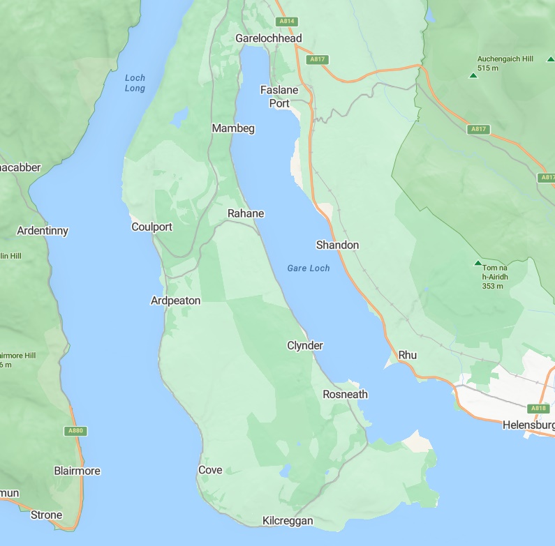 Rosneath is about 3 kilometres from the nearest significant village of Kilcreggan, which is sited on the southern end of the peninsula on the shores of the Firth of Clyde. There are also a number of significant villages bordering Rosneath, such as Clynder, Rahane, Mambeg and Garelochhead to the north and Cove and Kilcreggan to the Southwest. The Gare Loch, narrows at Rosneath to around 600 meters at a place known colloquially as ‘Rhu Narrows’, after the village of Rhu (formerly Row) on the eastern shore of the loch.