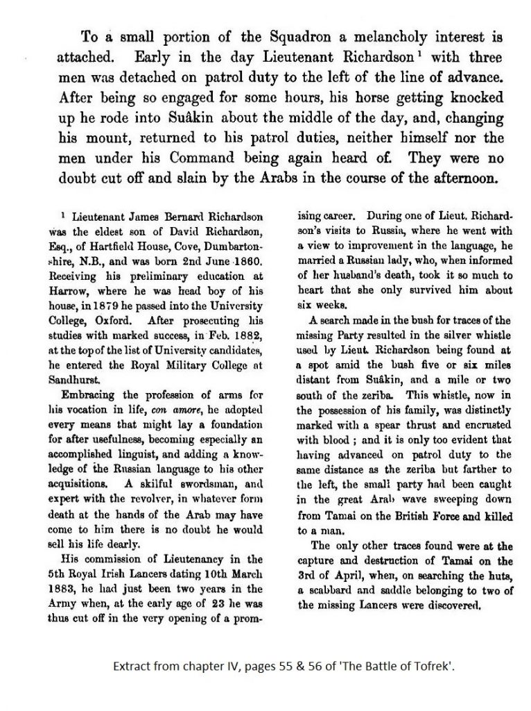 In one of the despatches from Suakim it is stated that “Richardson of the 5th. Lancers is missing – the worst is feared.” Mr. Richardson only recently joined the Lancers, and holds the rank of lieutenant. He is the only son of Mr. David Richardson, Glasgow.