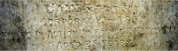 * CWGC and his Army records have 24th May for James’ death. Report in The Helensburgh and Gareloch Times has 22nd.