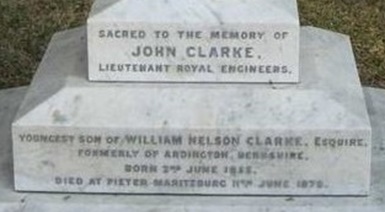 CLARKE – On the 11th. June at Pietermaritzburg, Natal, John Clarke, Lieutenant, Royal Engineers, younger son of the late William Nelson Clarke, Esq., formerly of Ardington Berkshire, aged 24.