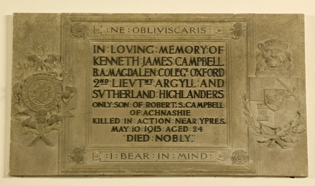 CAMPBELL – Killed in action at Ypres on 11th. May. Kenneth James Campbell, Second Lieutenant, 9th. Argyll and Sutherland Highlanders, aged 24, only son of Roberts S. Campbell, Achnashie, Rosneath.