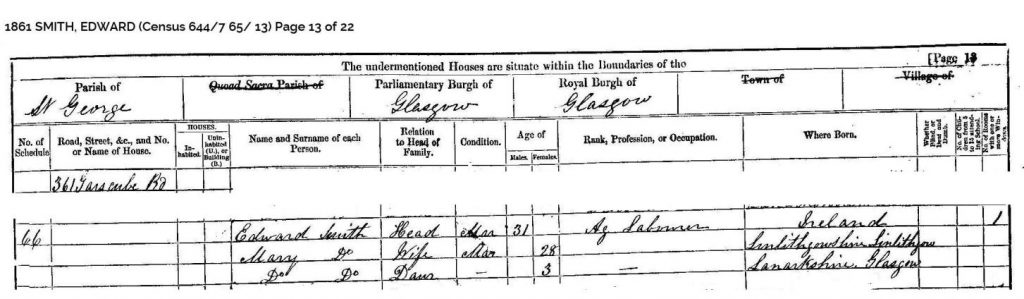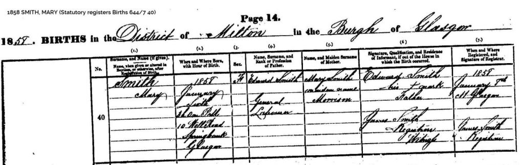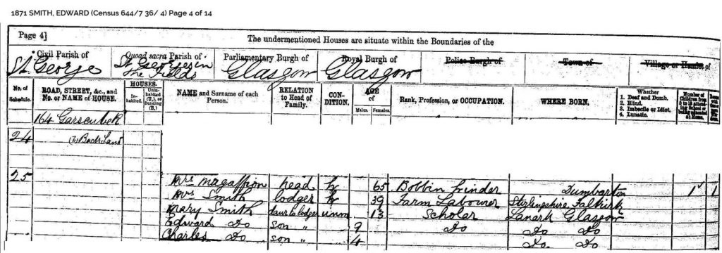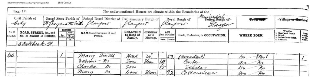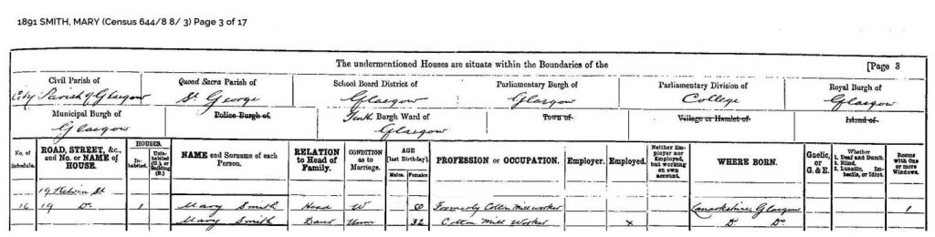Names – Mary Smith, head, widow, age 60, formerly Cotton Mill worker, born Glasgow.