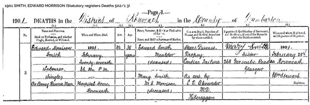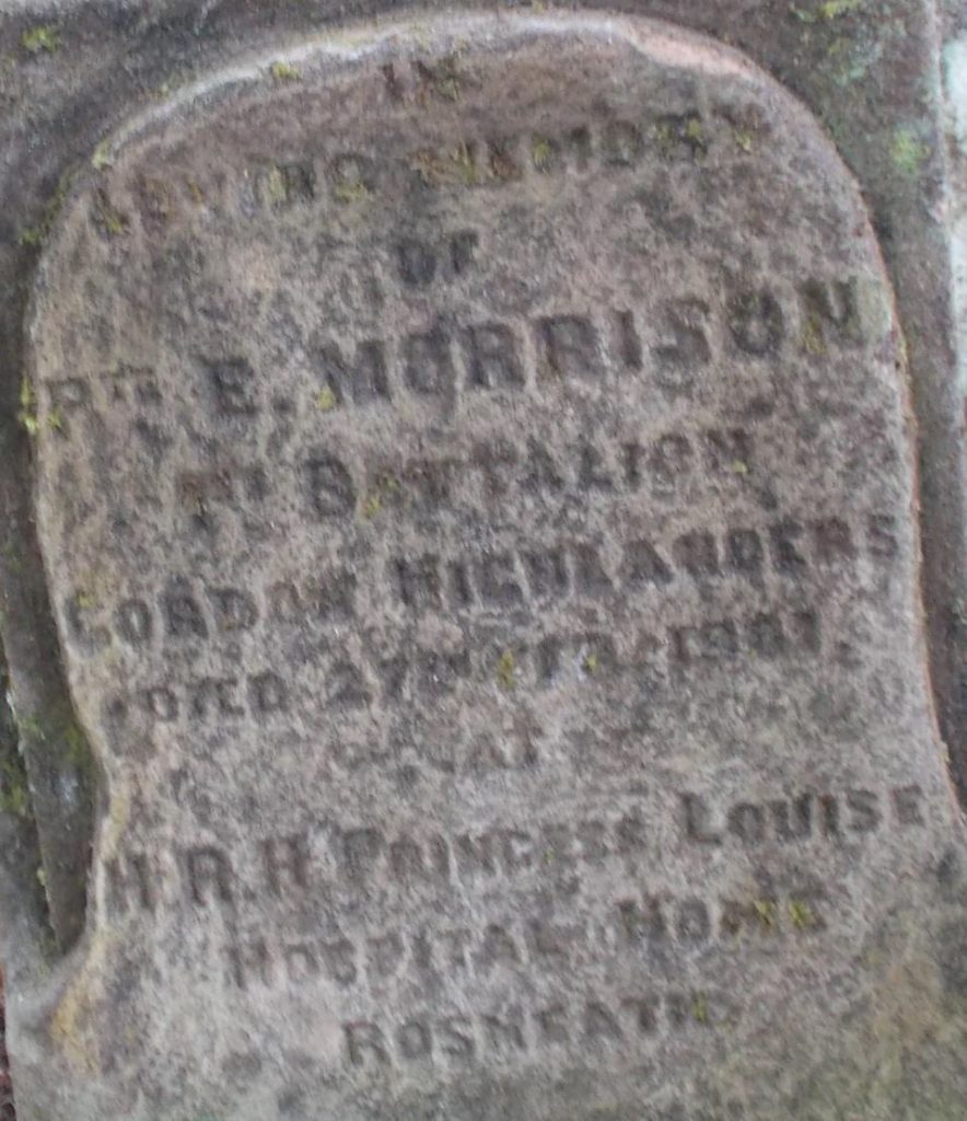 - Edward Morrison (Smith) 1st Battalion Gordon Highlanders died 27th Feb. 1901at H.R.H. Princess Louise Hospital Home, Rosneath, died from his injuries after the 1889-1902 Second Boar War .